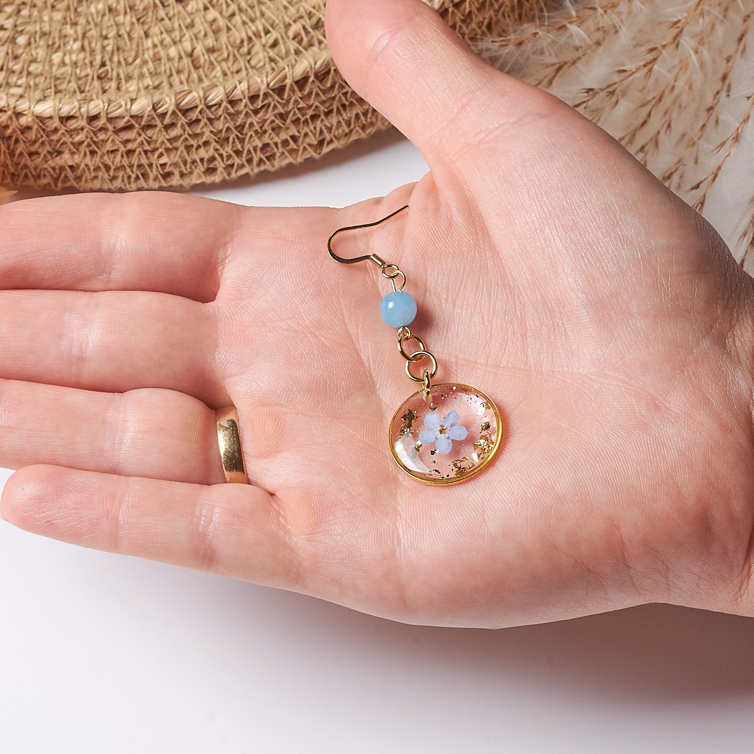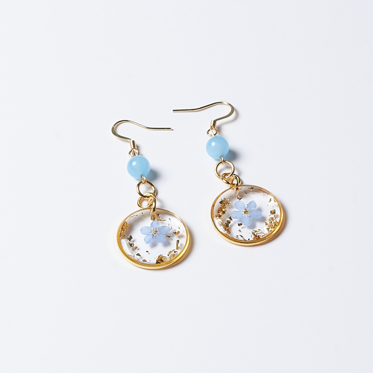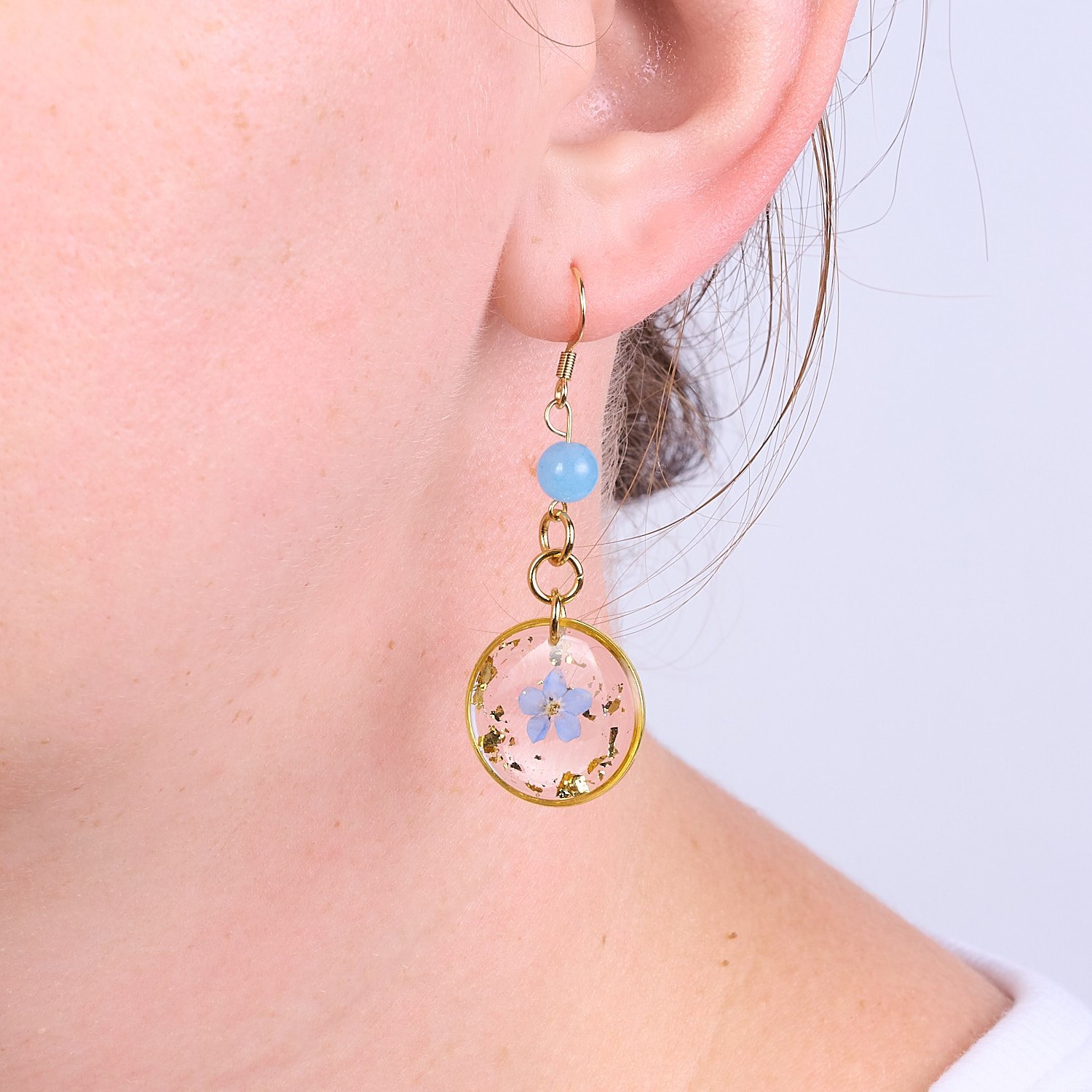 These beautiful earrings with real forget-me-not flowers embedded are perfect for everyday wear or special occasions. They also make a wonderful gift. Forget-me-nots represent enduring feelings and deep bonds between people. They are often associated with eternal love, sincere friendships, and remembrance of loved ones. These flowers also symbolize the hope that the bond between two people will withstand the test of time and separation. The earrings also feature an aquamarine bead. Aquamarine symbolizes peace, harmony, courage, and clarity of mind.