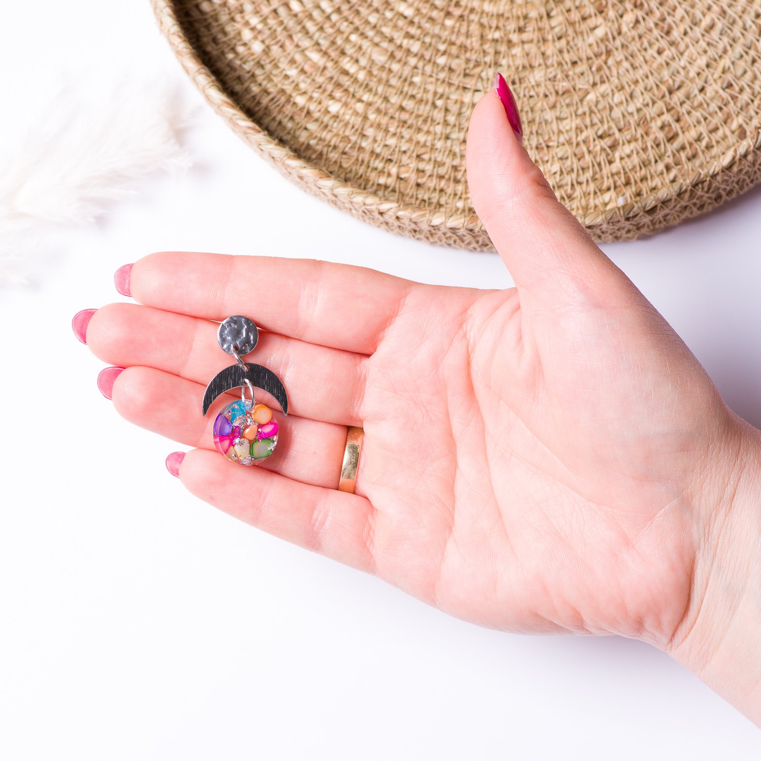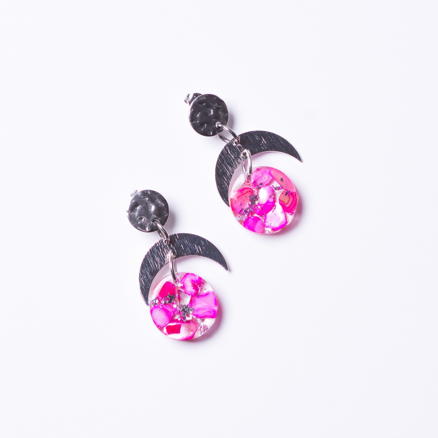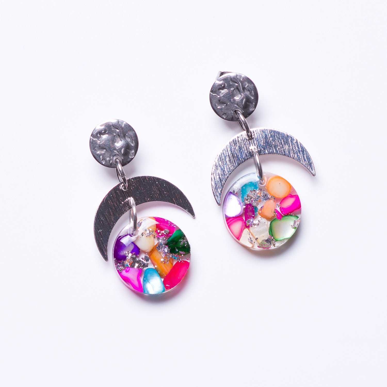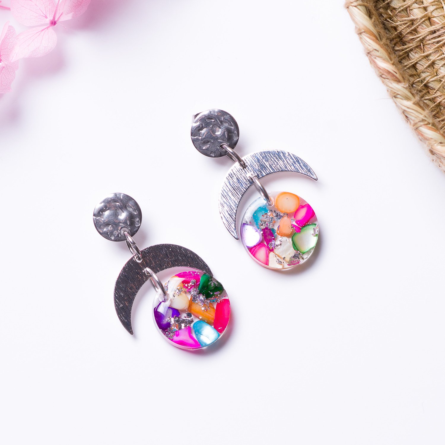 The studs are made of stainless steel, and the crescent moon metal is silver-plated. The earrings measure 3.5 cm in length. Available in 2 colours pink and multicolour.