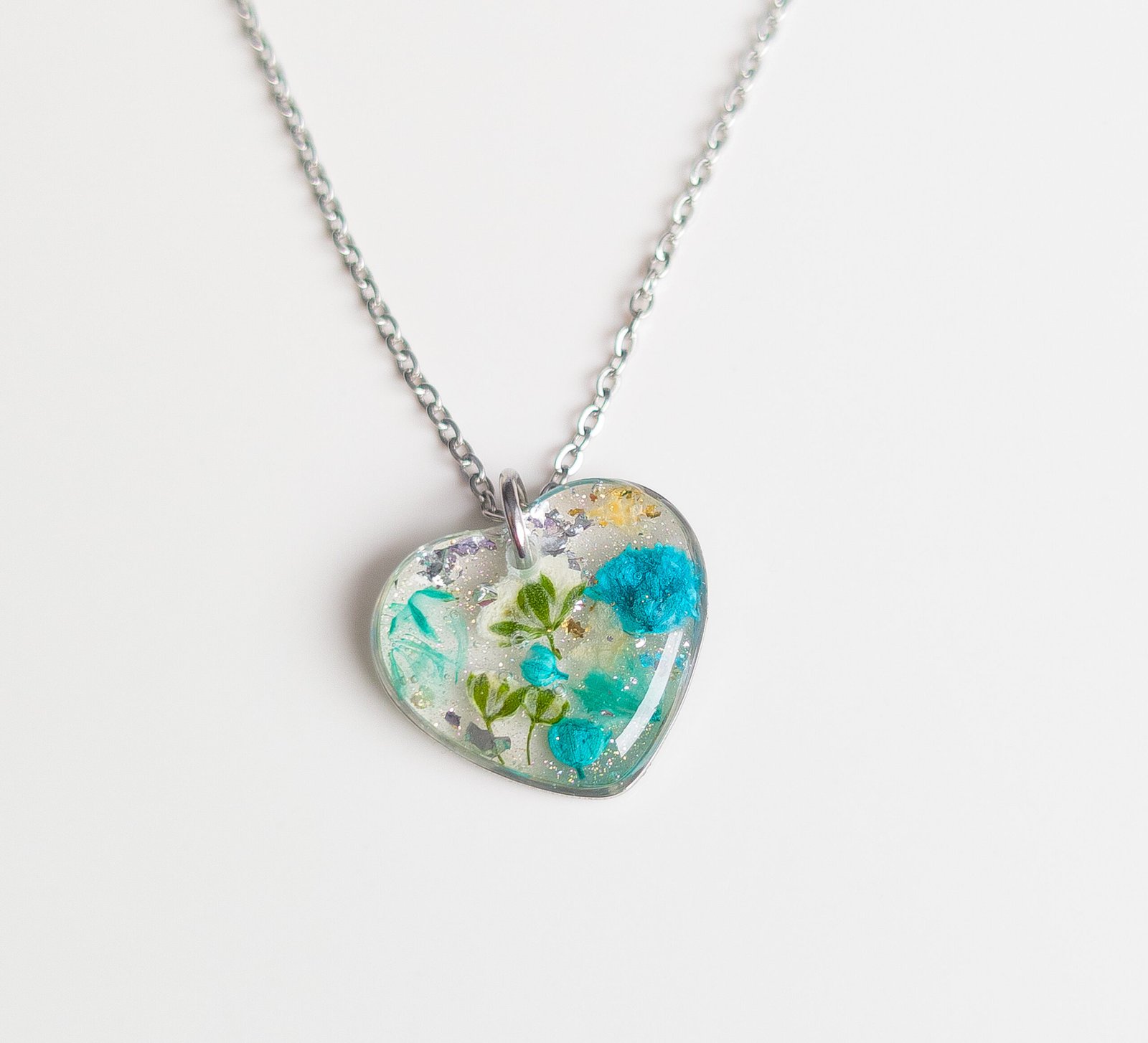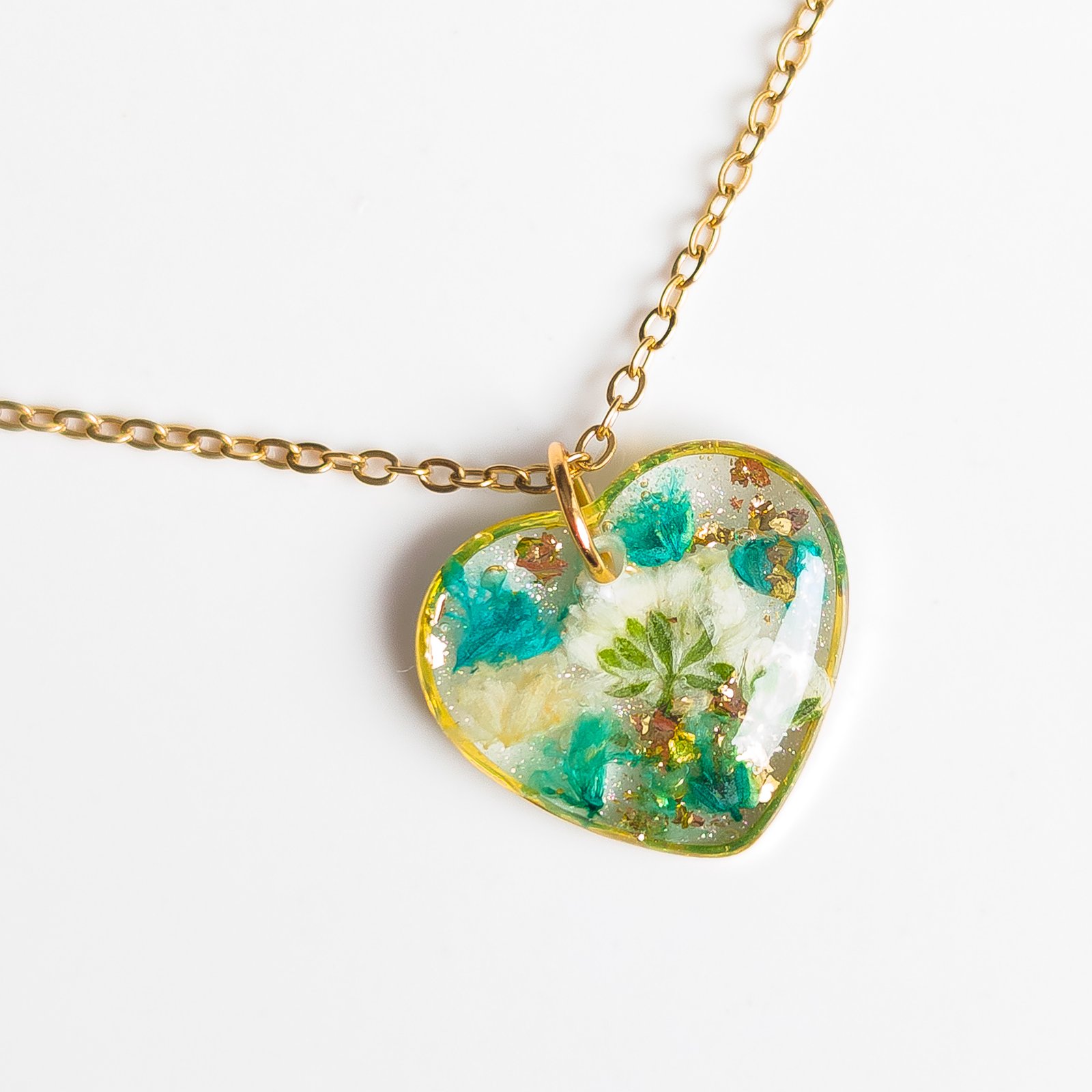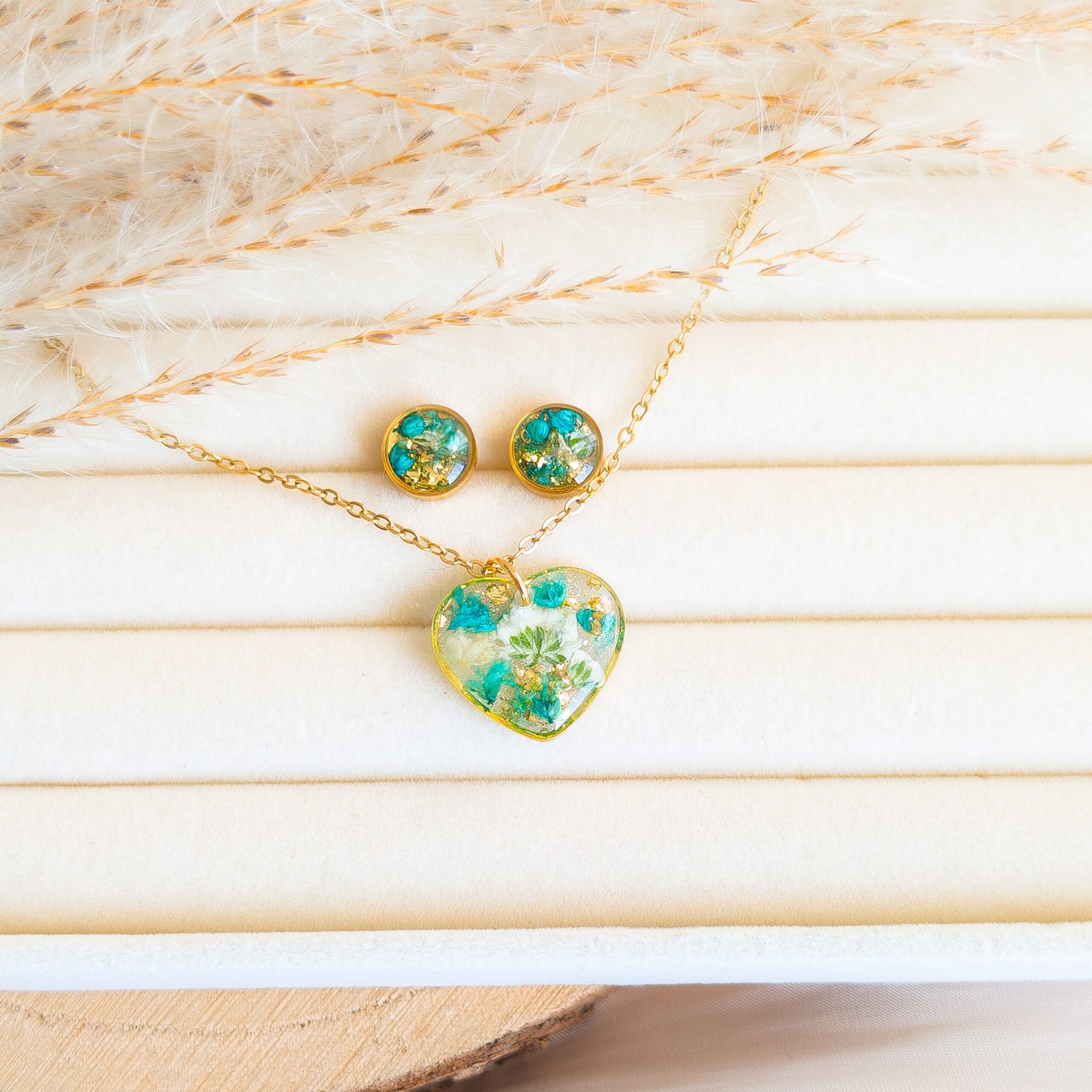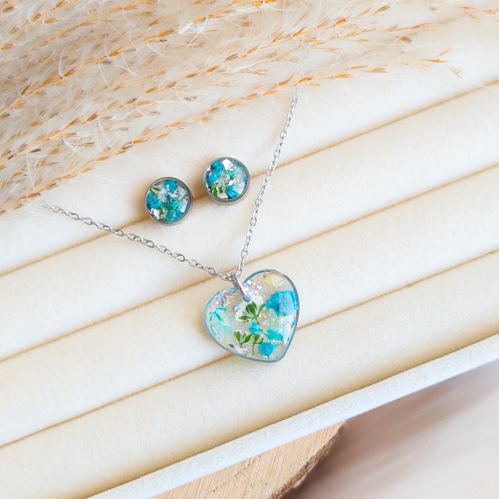 Delicate jewellery set with dried white and turquoise flowers, featuring stud earrings and a heart necklace, perfect for spring and summer as well as a unique gift. The studs have small flower inserts measuring 1 cm in diameter, the necklace pendant is a 2 cm heart with a 45 cm chain plus 5 cm extension. Available in gold or silver version, made of stainless steel, each piece is handmade and completely unique, lightweight and comfortable to wear.