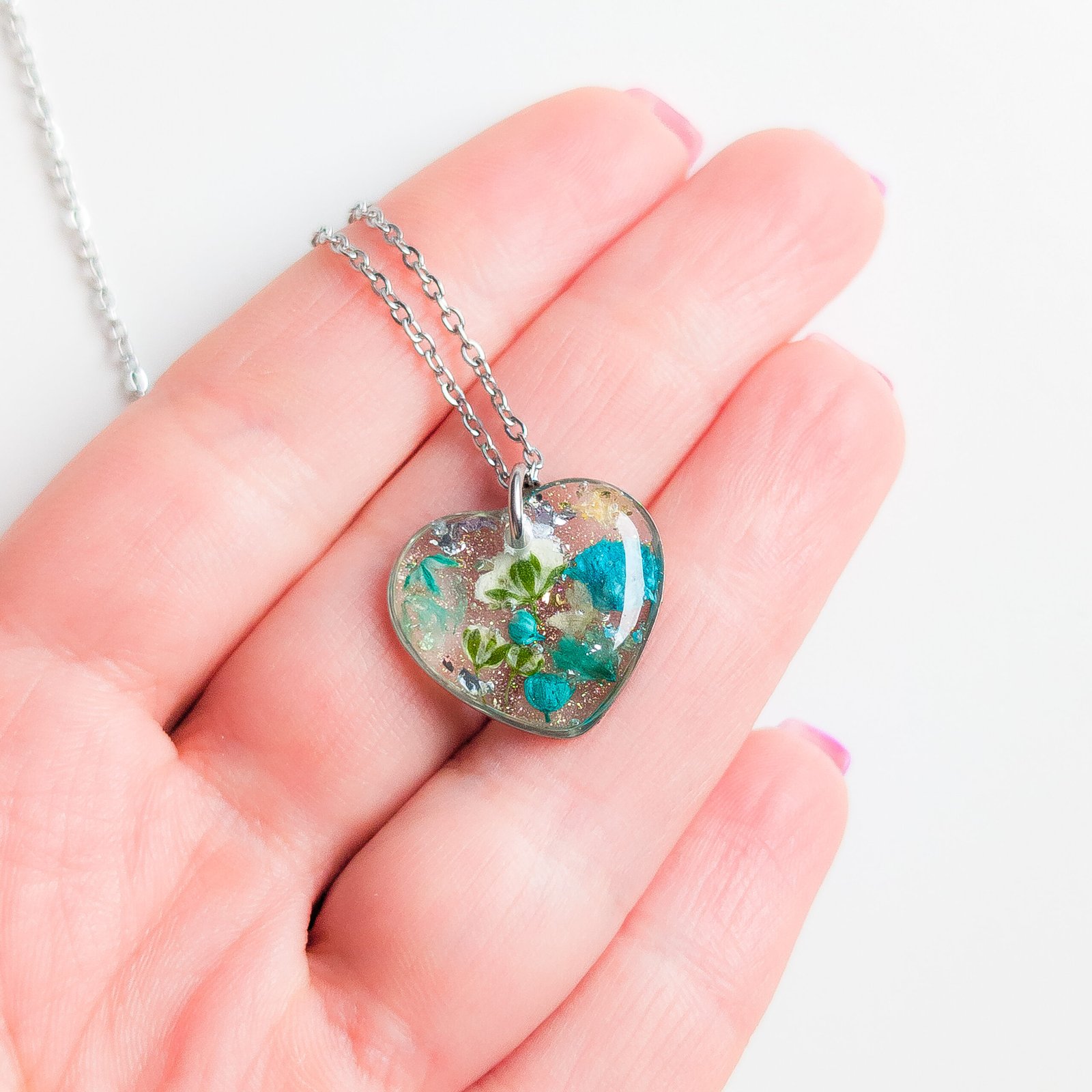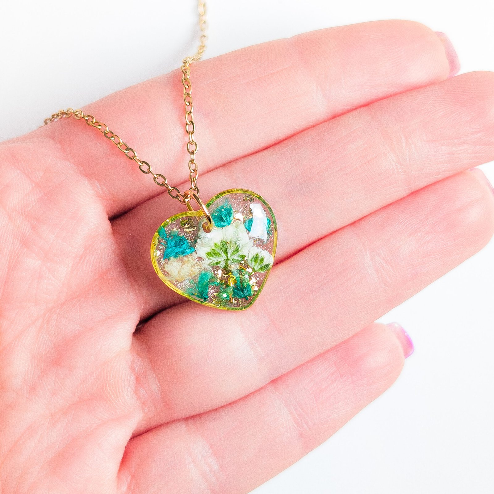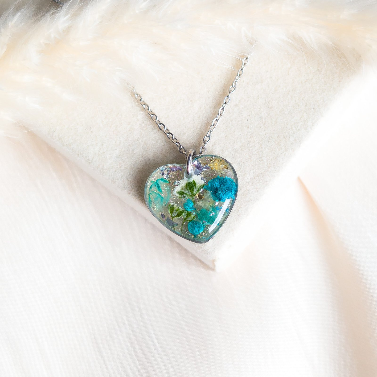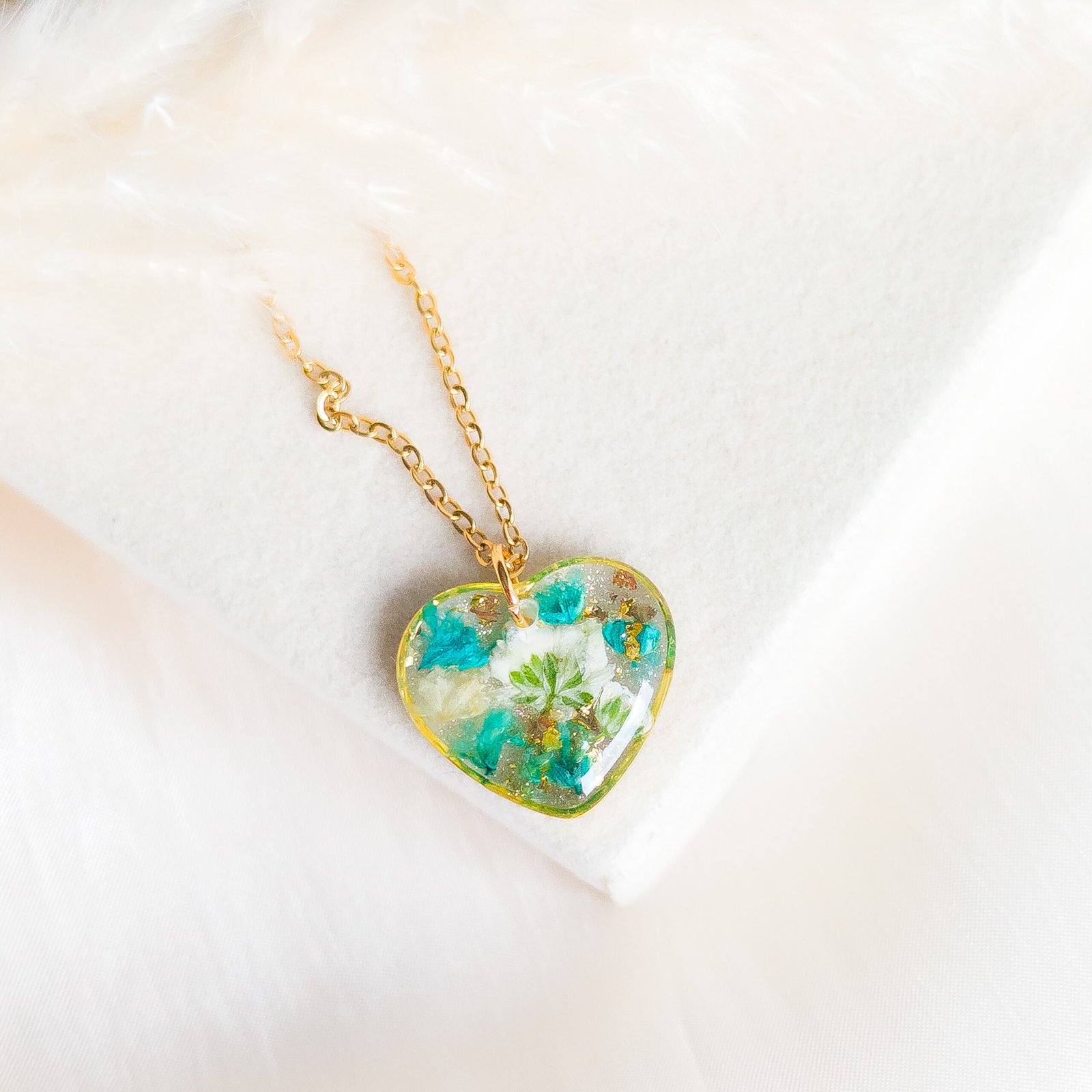 Delicate jewellery set with dried white and turquoise flowers, featuring stud earrings and a heart necklace, perfect for spring and summer as well as a unique gift. The studs have small flower inserts measuring 1 cm in diameter, the necklace pendant is a 2 cm heart with a 45 cm chain plus 5 cm extension. Available in gold or silver version, made of stainless steel, each piece is handmade and completely unique, lightweight and comfortable to wear.