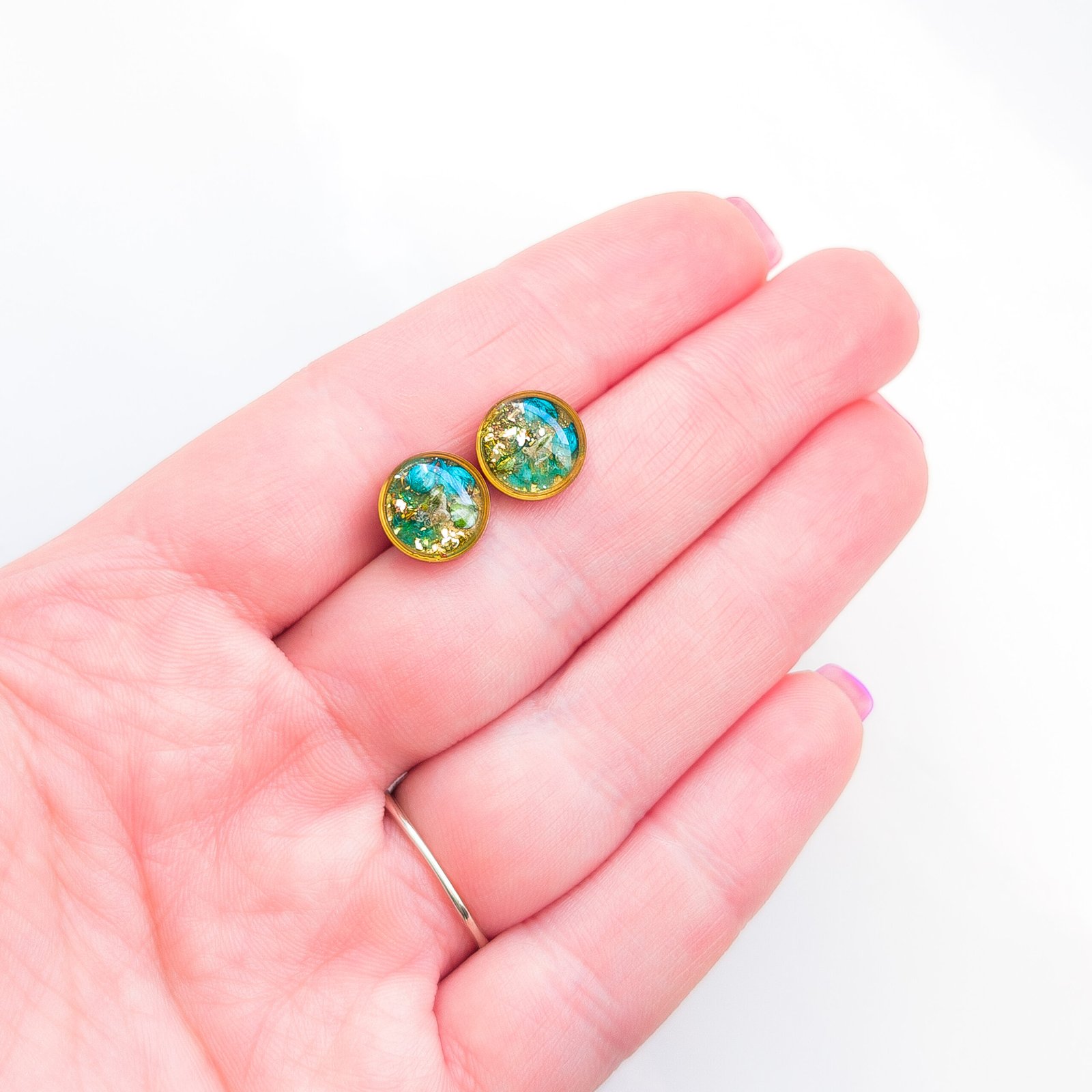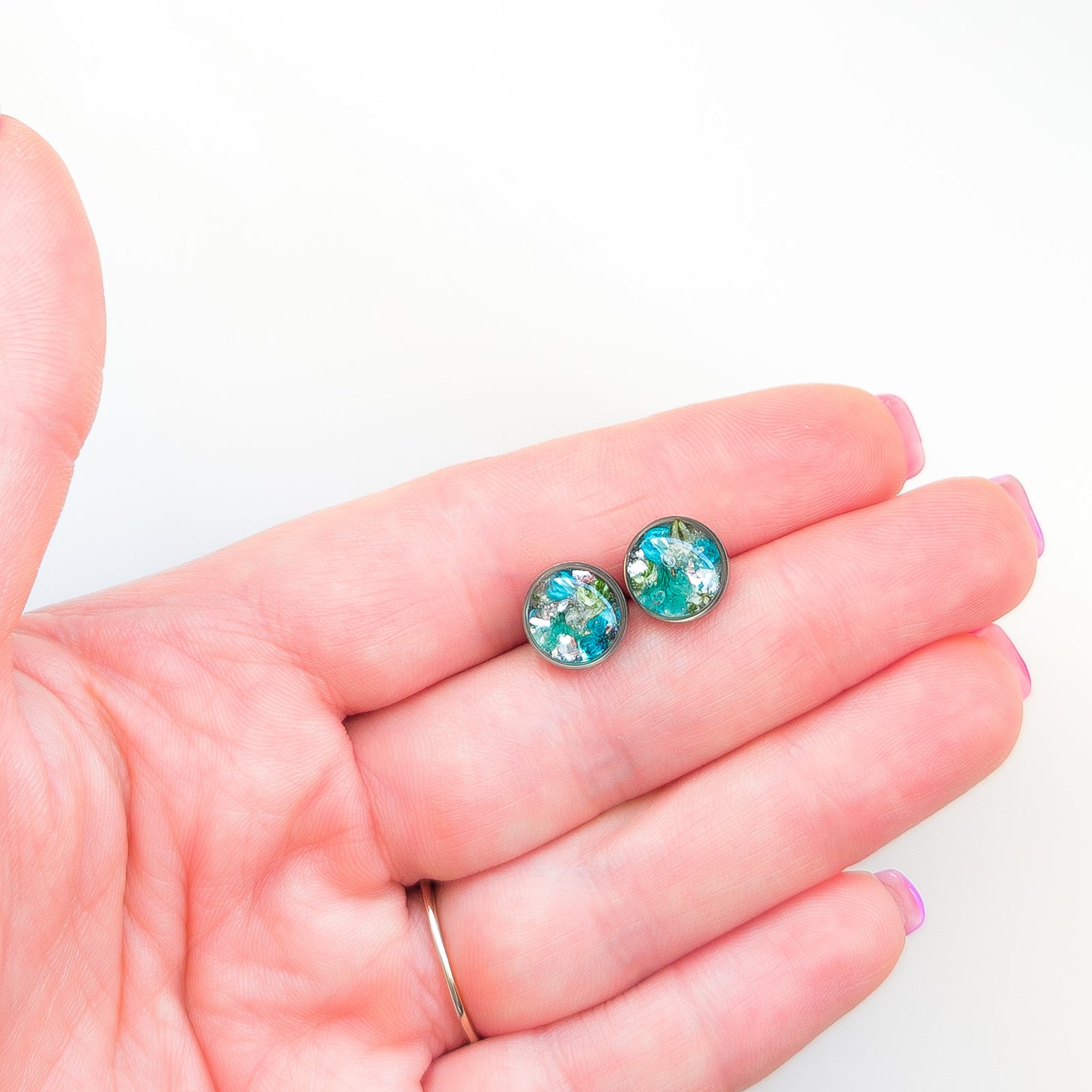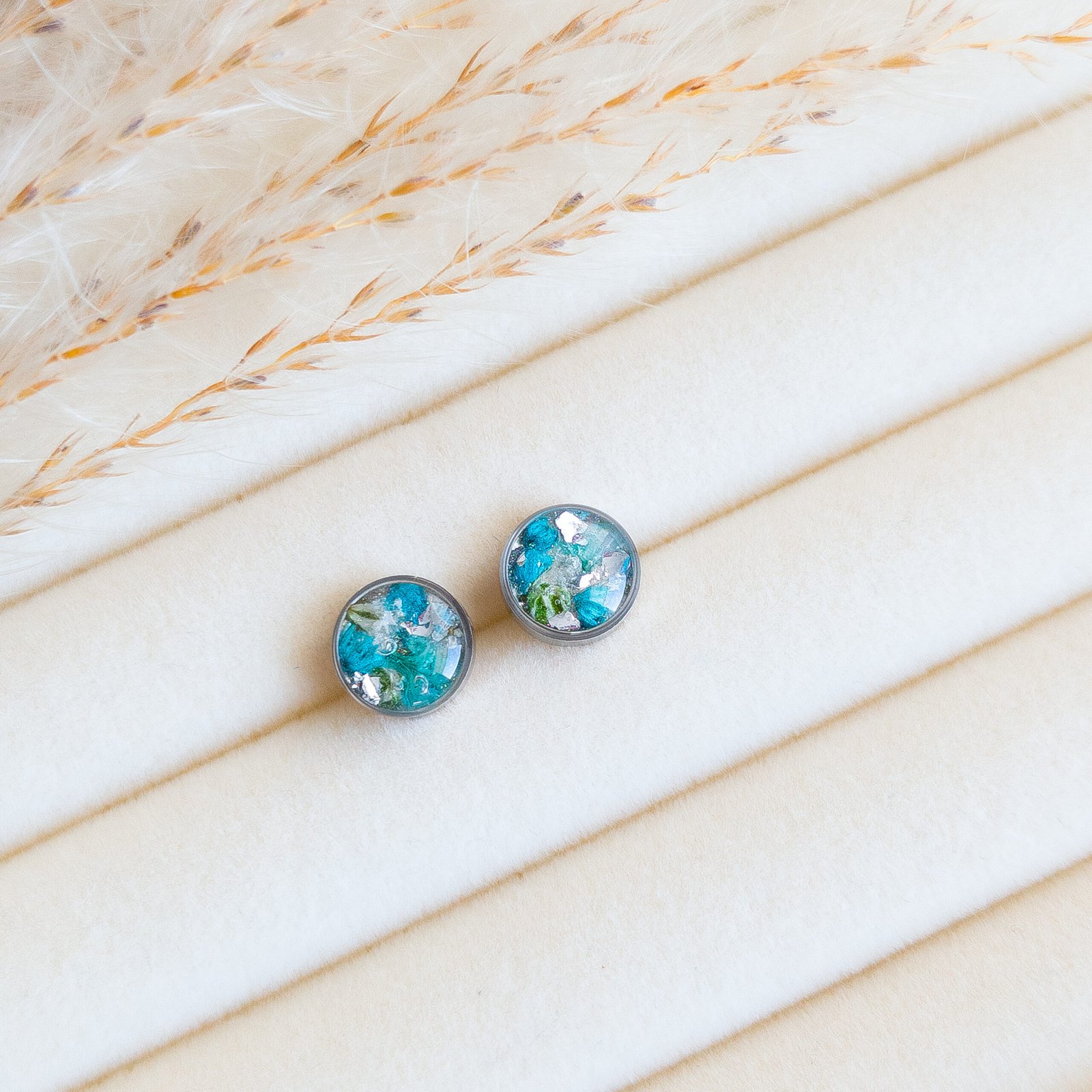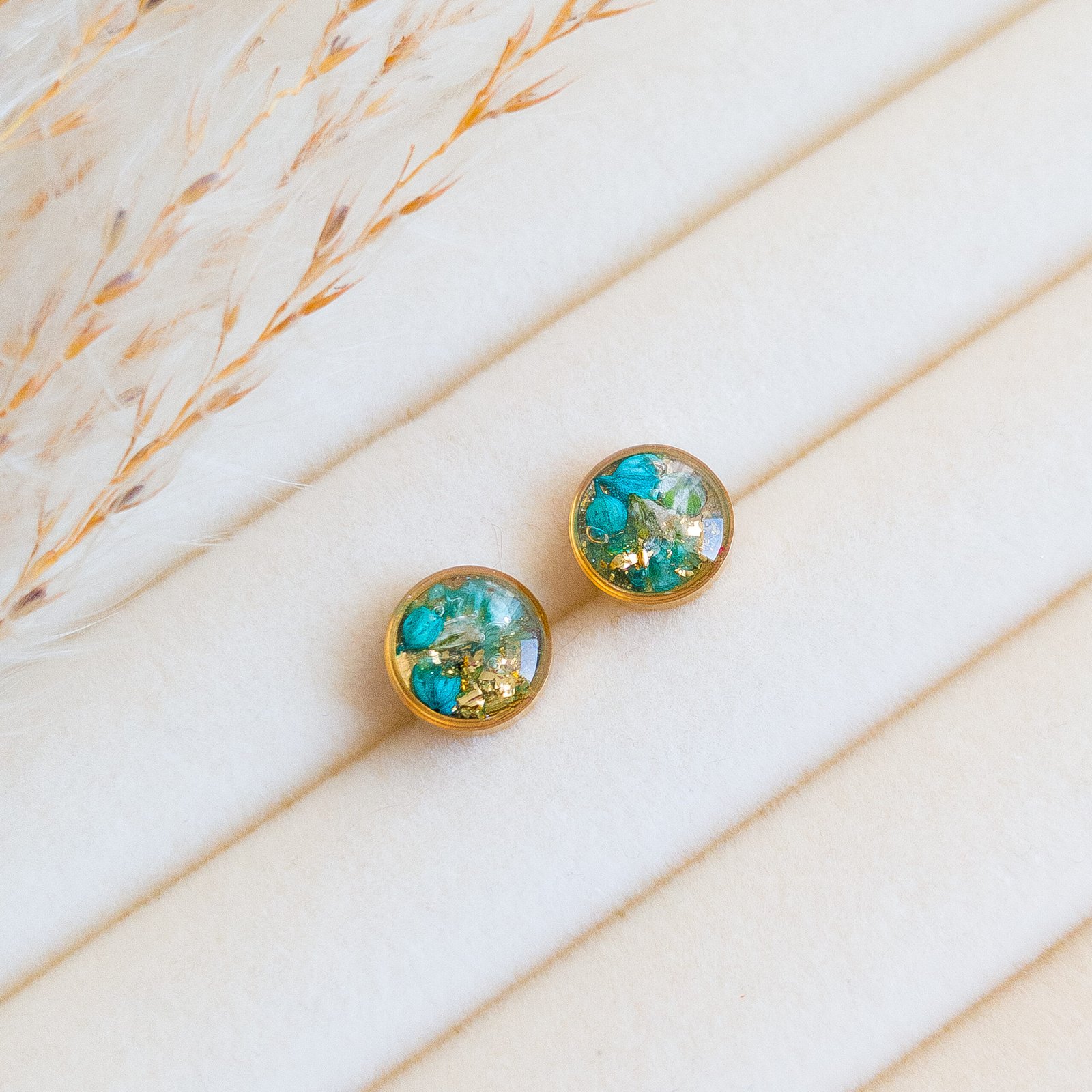 Delicate jewellery set with dried white and turquoise flowers, featuring stud earrings and a heart necklace, perfect for spring and summer as well as a unique gift. The studs have small flower inserts measuring 1 cm in diameter, the necklace pendant is a 2 cm heart with a 45 cm chain plus 5 cm extension. Available in gold or silver version, made of stainless steel, each piece is handmade and completely unique, lightweight and comfortable to wear.